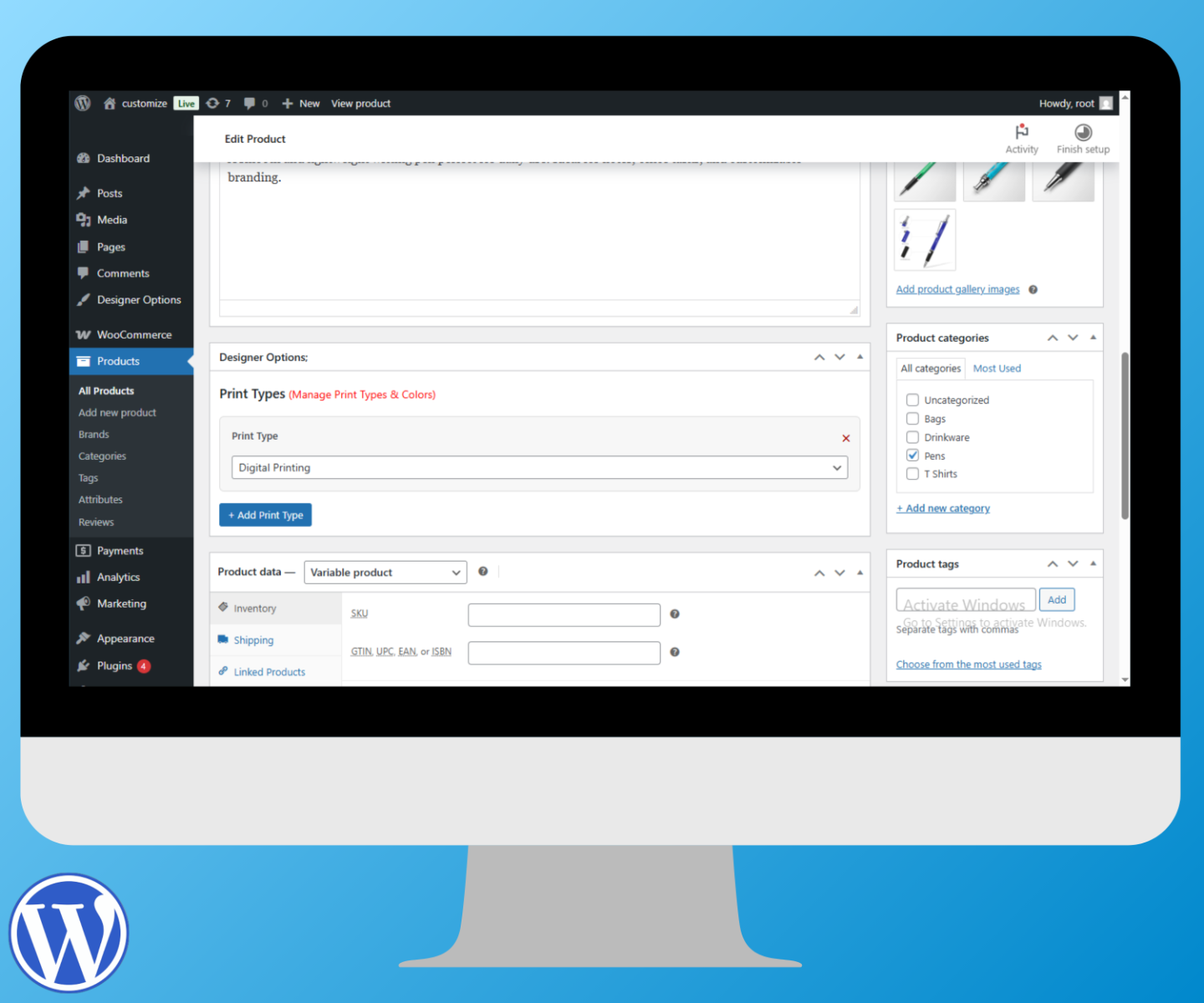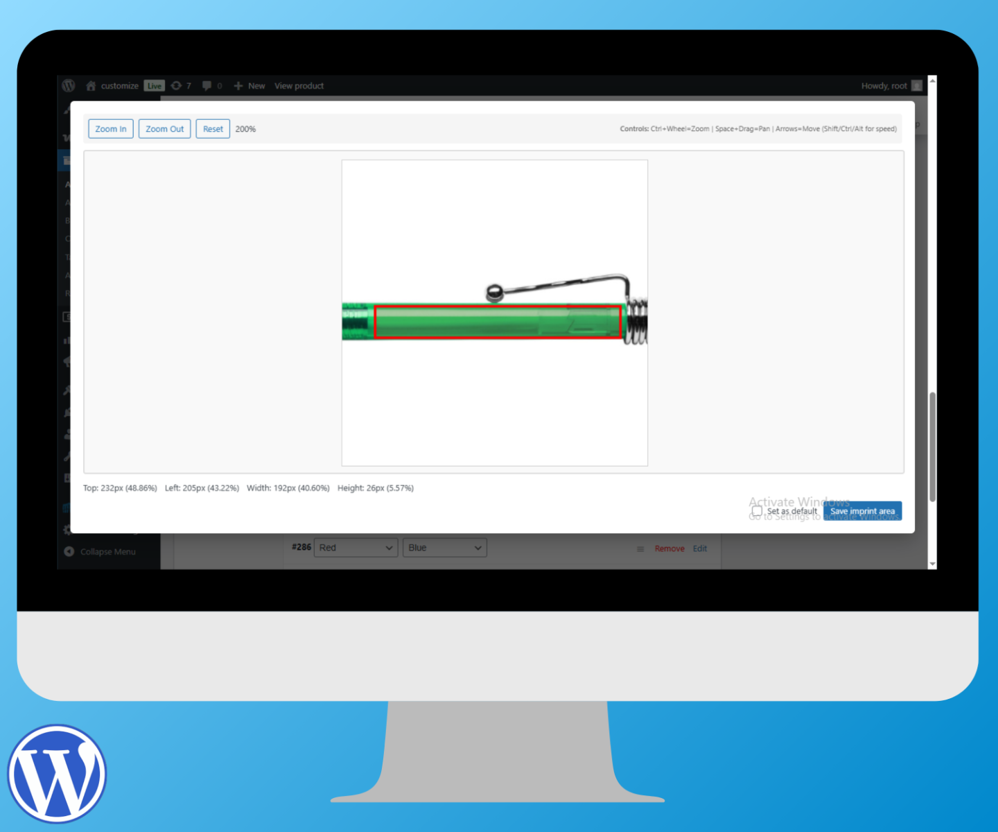 You can set imprint areas for each product variation, manage print types, define available colors, apply logo rules, enable or disable the customizer per product, and configure everything needed to make the final design production-ready.
